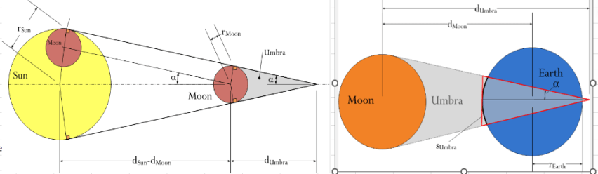 The calculation of the width of the totality path can be found on the internet, such as https://www.mathscinotes.com/2017/08/calculate-eclipse-path-width/. On the left of Figure 3, the Moon’s umbra is shown and the right shows the umbra touching the Earth surface. Using the radii of the Sun (435,000miles), Earth (3,986 miles) and Moon (1,086 miles), and the distances of the Earth to the Sun (93,639,659 miles) and Moon (224,880 miles) at the time the 4/8/2024 solar eclipse occurred, you can compute the diameter of the umbra on the Earth’s surface to be about 120 miles. This width is consistent with the 108 – 122 miles published by NASA on its website.