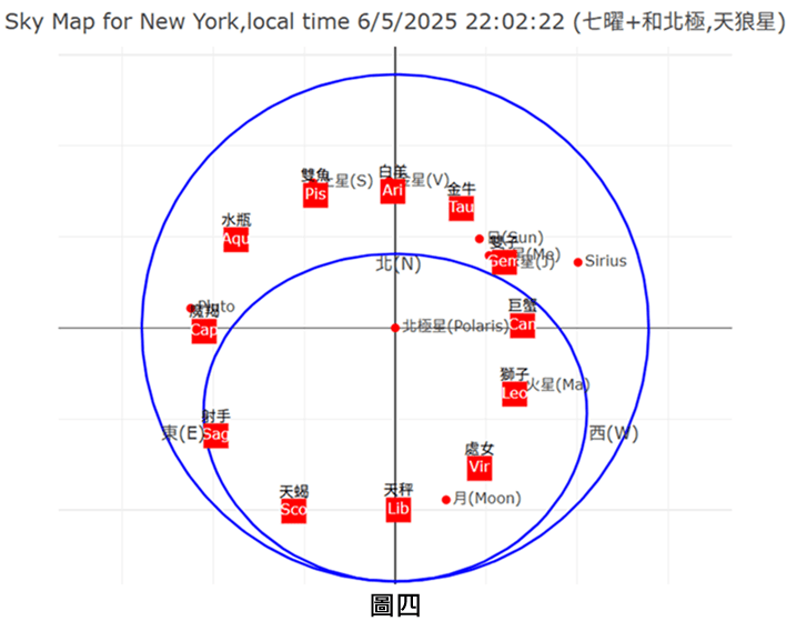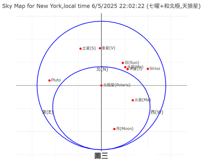 圖三是代表2025年6月5日 下午10點2分22秒的紐約天象圖. 這是選紐約市,然後點NOW得到的圖. 圖上有七曜(日,月,水,金,火,木,土星),還有北極星,天狼星(Sirius,天上最亮恆星)及冥王星 (Pluto). 注意這時已經晚上10點多, 所以太陽已經下山, 它的位置是在內圈之外, 也就是我們看不到的地方(晚上當然看不到太陽).