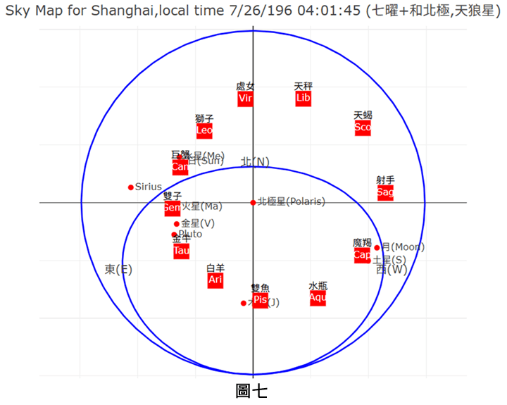 羅貫中寫的三國演義在第十四回, “時侍中太史令王立私謂宗正劉艾曰:「吾仰觀天文, 自去春太白犯鎮星於鬥牛, 過天津, 熒惑又逆行, 與太白會於天關, 金火交會, 必有新天子出. 吾觀大漢氣數將終, 晉魏之地, 必有興者」” 太史令王立講吾仰觀天文的時間是在建安元年(公元196). 熒惑是火星, 太白是金星. 筆者考證, 熒惑與太白會於天關 應是公元196年的7/26. 把這個日子填入筆者的這個App內, 時間拉到太陽還沒上升的時刻(夜空還看得到熒惑與太白), 城市選上海, 那麼曹操的太史令王立所看到的天象圖就如圖七, 12星座也加進去. 果然, 火星與金星都在天關星的金牛座附近.