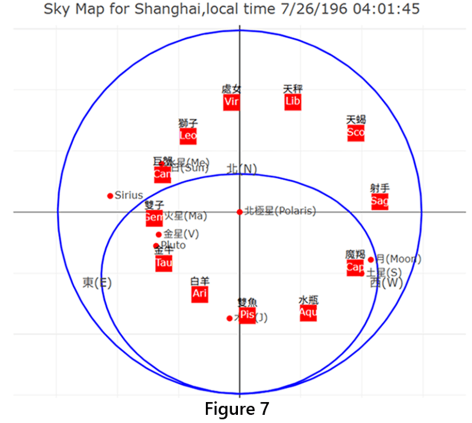 The Three Kingdoms Romance (三國演義) era Sky Map on 7/26/196: In the fourteenth chapter of the Three Kingdoms Romance (三國演義) written by Luo Guanzhong (羅貫中), “At that time, the Imperial Historian Wang Li (王立) privately told the Imperial Clan Minister Liu Ai (劉艾): “I looked up at the sky and found that since last spring, Venus (太白) has violated Saturn (鎮星) in the region of Sagittarius and Capricorn and passed Deneb (天津星). Mars is also retrograde and will meet Venus in the direction of Zeta Tau star (天關星). When gold (referring to Venus) and fire (referring to Mars) meet, a new emperor will surely appear. I see that the fate of the Han Dynasty will end, and the land of Jin (晉) and Wei (魏) will surely rise. ” The Imperial Historian Wang Li said that he looked up at the sky in the first year of Jian’an (建安元年; 196 AD). The author has verified that Mars (Yinghuo; 熒惑) and Venus (Taibai; 太白) met at Zeta Tau (Tianguan; 天關) on July 26, 196 AD. Fill this date into the author’s app, drag the time to the time when the Sun has not risen (Mars and Venus can still be seen in the night sky), and choose Shanghai as the city. Then the sky map seen by Cao Cao’s (曹操) Imperial Historian Wang Li (王立) is as shown in Figure 7, and the 12 constellations are also added. Sure enough,