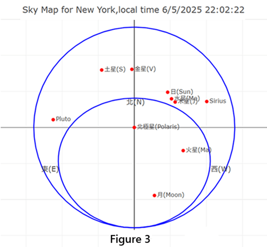 2025. This is the map obtained by selecting New York City and clicking NOW. The map shows the seven celestial bodies (Sun, Moon, Mercury, Venus, Mars, Jupiter, Saturn), as well as the North Star, Sirius (the brightest star in the sky) and Pluto. Note that it is already past 10 pm, so the Sun has already set, and its position is outside the inner circle, which is where we cannot see it (of course we cannot see the Sun at night).