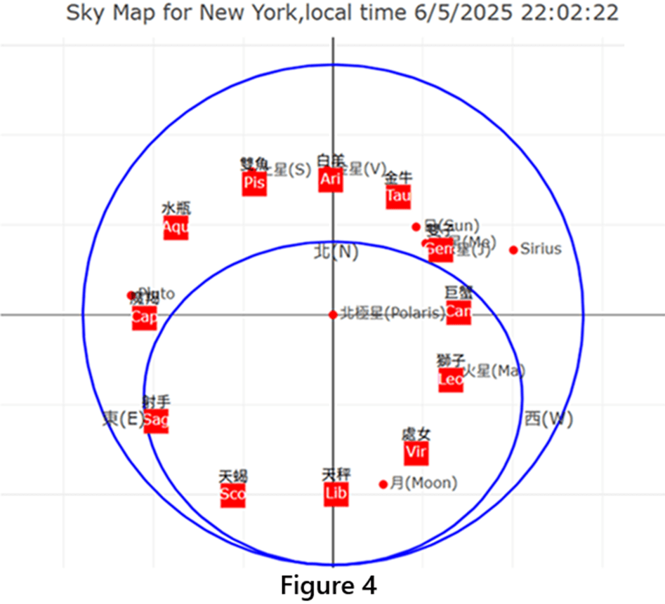When the sky map is first drawn, it is necessary to test whether it is drawn correctly: for example, for each selected city, the Sun is on the eastern horizon at sunrise, the Sun is directly above the head of the observer in that city at solar noon time (not necessarily 12pm of the city time), and the Sun is on the western horizon at sunset. In addition, it is also necessary to check NASA data and various information from other astronomical websites.