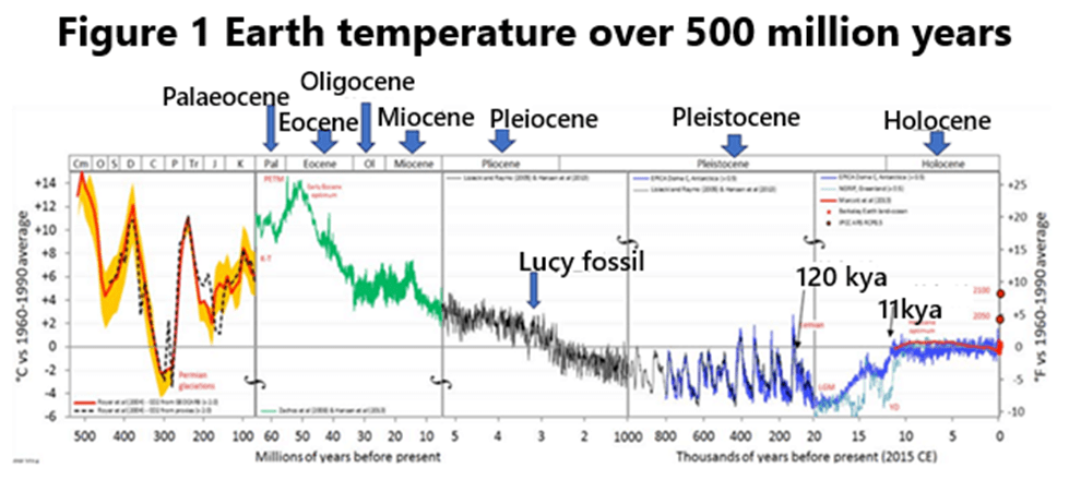 Ancient Climate Changes – Since its birth 4.5 billion years ago, the Earth has gone through a series of considerable changes. Initially, as the Earth was formed, it attracted small rocks scattered in its orbit; the huge heat generated by the collision of these rocks made the Earth like a ball of molten lava. The surface temperature is estimated to be as high as 1,982 oC. This hot ball of fire was in the extremely cold universe, so it had to cool down. Then, volcanic eruptions began to form an atmosphere, which mainly consisted of carbon dioxide and water vapor (some water may have come from asteroids bombarding the Earth in earlier time). As the surface cooled further, the water vapor condensed into water, and this formed oceans and rivers. Figure 1 shows the temperature changes of the Earth over the past 500 million years. For most of the time between 500 million and 3 million years ago, Earth’s temperature was higher than it is now.