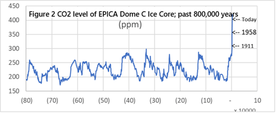 Each gas in the atmosphere has its own cycle to create a state of balance. If there is a slight abnormality somewhere in the cycle, nature will adjust the imbalance and reach rebalance. For example, there was no oxygen in the early Earth’s atmosphere. Later, life appeared on Earth. These lives (plants and other organisms) used sunlight to produce photosynthesis. In the process of water and carbon dioxide producing energy, oxygen was released. The concentration of oxygen in the atmosphere has been imbalanced and rebalanced for more than 2 billion years, and has slowly increased to the current 20% level. As for carbon dioxide, it has its own cycle to create a balance in each geological era. Figure 2 shows the carbon dioxide concentration in the past 800,000 years after the Antarctic ice column 3 kilometers