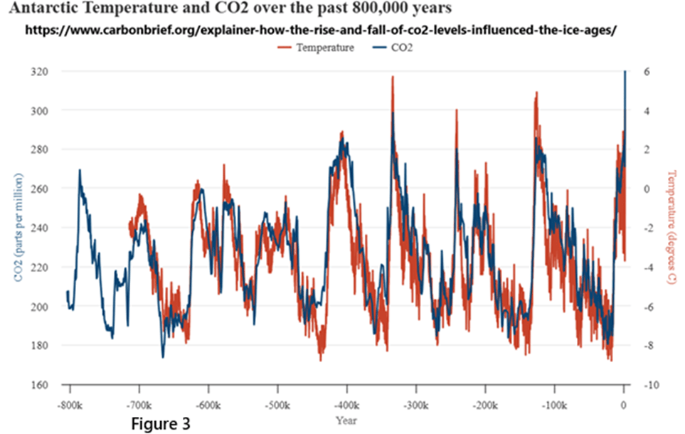 underground was dug out and analyzed. After analysis, it shows that although the concentration has fluctuated, it has always been below 300 ppm. The shocking excess occurred only after the 20th century. Today, the carbon dioxide concentration has reached 420 ppm. Could it be that human beings have been frantically pursuing civilization and progress for more than a hundred years, burning coal and cutting trees, and destroying the ecology, pushing the carbon dioxide concentration to a crazy level in a short period of time? For such a high level of carbon dioxide, how will today’s Earth respond in terms of temperature change? More specifically, how closely has the concentration of carbon dioxide been related to the Earth’s temperature since ancient times? Figure 3 shows the close relationship between the two over the past 800,000 years (the red line is temperature; the blue line is carbon dioxide concentration). Seeing this graph, many people would inevitably draw a causal conclusion: it is because of the change in carbon dioxide that the Earth’s temperature changes.