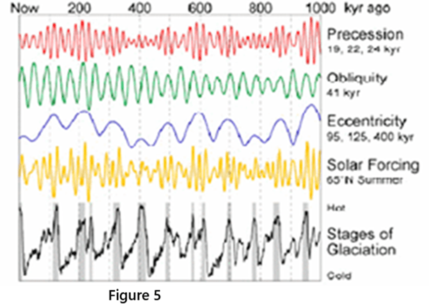 slightly, but the Earth’s temperature continued to rise. Therefore, the Earth’s temperature has not changed in lock step with the changes in carbon dioxide. This means that there are many factors that cause climate change, not just carbon dioxide. And carbon dioxide does not seem to be the dominant factor either. In fact, the Earth has experienced many ice ages in the past 800,000 years. Serbian scientist Milutin Milankovitch began to study, in 1911, the causes of the ice ages that have occurred on the Earth in the past 800,000 years. He was convinced that the change in the position of the Earth relative to the Sun would drive the long-term climate and trigger the Ice Age. He carefully studied the Earth’s orbit itself, the rotation of the Earth’s axis and how the angle of the axis was affected by the gravitational forces of the Sun, Moon, and planets. He found that 1) the Earth’s orbit changes from less elliptical to more elliptical with a periodicity of about 100,000 years, 2) the angle between the Earth’s axis and the vertical line of the Earth’s orbit changes from 22 degrees to 24.5 degrees with a periodicity of about 41,000 years, and 3) the precession of the Earth’s axis (swinging like a spinning top) takes about 22,000 years to complete a 360-degree circle. These three cycles are well known and are now called the “Milankovitch Cycles”. Due to these three cyclical changes of the Earth itself, the direct refraction angle of sunlight on the Earth will change at a slow pace of tens of thousands of years, resulting in different insolation energy received by the Earth in each period. Too little insolation energy will trigger the occurrence of an Ice Age (Figure 5). Milankovitch’s theory holds that the amount of sunlight received by the Earth is the cause, and the resulting change in the Earth’s temperature is the effect. Qualitatively, his theory is accepted