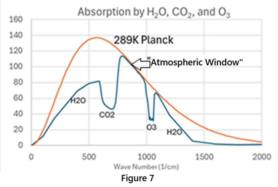 In order to achieve balance, the Earth and the atmosphere need to release 239 watts of heat energy to outer space. To reach outer space, the heat energy on the surface of the Earth needs to pass through the test of GHG (water vapor, CO2, ozone, etc.) in the atmosphere. These GHG gases can absorb heat energy only in certain bands, and the absorption intensity is also different. The author uses an atmospheric model, including the change of temperature and gas density with altitude, to calculate the absorption of three GHGs (water vapor, CO2, ozone), and the results are shown in Figure 7. The red curve represents the heat energy of the Earth’s surface temperature of 16 oC, which begins to dissipate heat to the atmosphere. The total heat energy of all