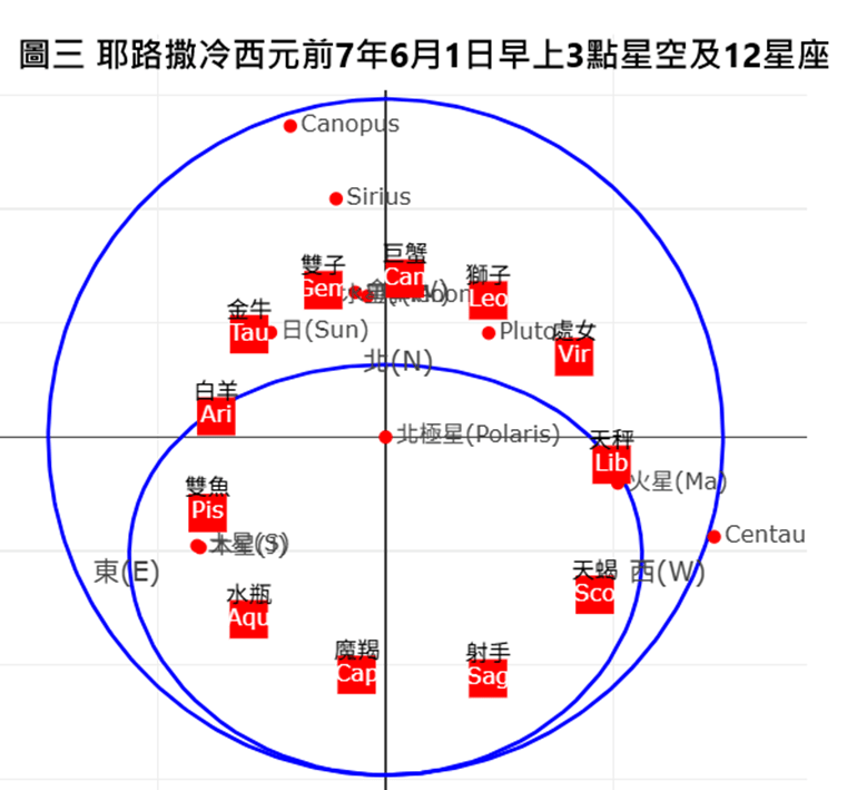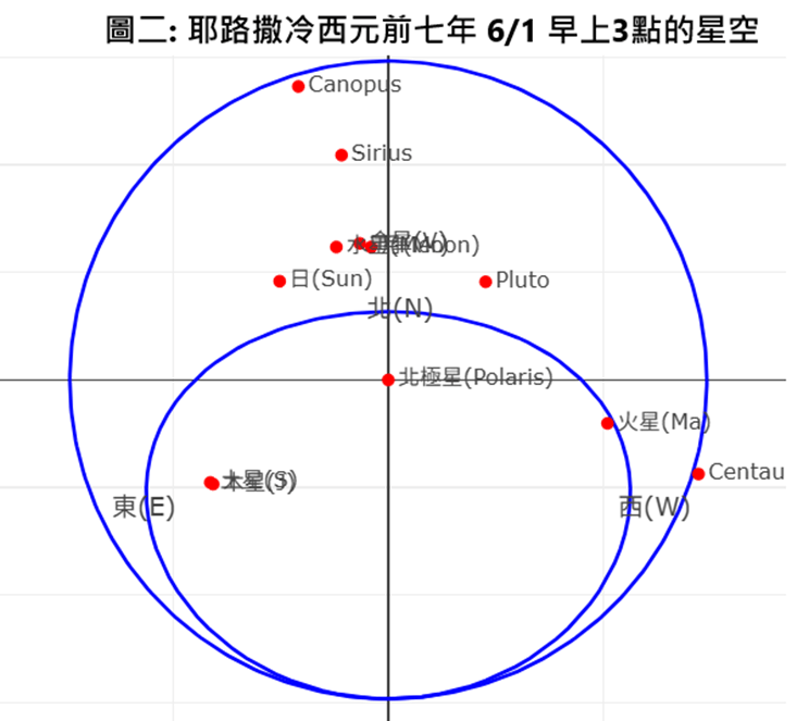 圖2就是筆者用最近開發的天象圖App畫出來的耶路撒冷在西元前7年的6月1日的凌晨3點的星空. 內圈的圓周就是耶路撒冷的東西南北地平線. 圈內的星星包括有東方的土星木星以及西方在地平線快要下山的火星. 內圈外